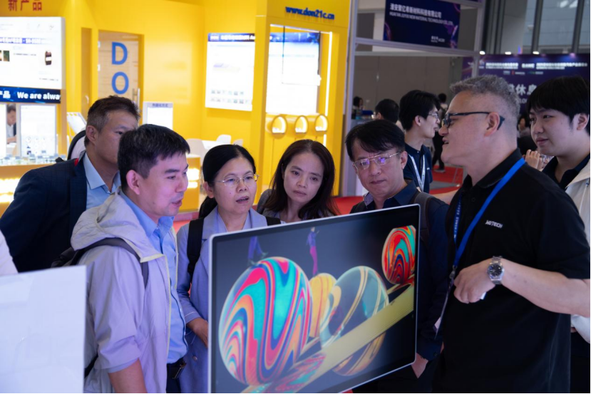 在必赢242net官网展台,全球首创的32寸0OD精准光源玻璃基Mini LED触控屏一体机以其6mm的超薄机身和媲美OLED的显示效果,成为现场最具人气的产品之一。